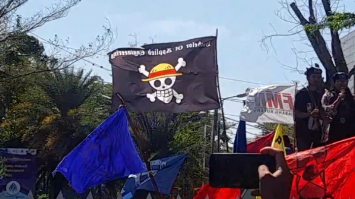 Di antara bendera dan spanduk tuntutan, tampak berkibar bendera bajak laut Topi Jerami dari serial anime populer One Piece. Bendera ini menarik perhatian publik karena biasanya diasosiasikan dengan kebebasan, solidaritas, dan perlawanan terhadap ketidakadilan.